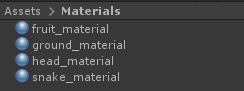 - כעת עבור חומרים, צור 4 חומרים (לחץ ימני -> צור -> חומר) ושם אותם בהתאמה "ground_material", "snake_material", "head_material" ו-"fruit_material":
