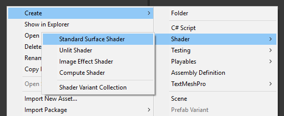 - לחץ לחיצה ימנית על תצוגת הפרויקט -> צור -> Shader -> Standart Surface Shader