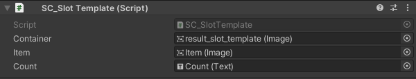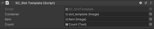 - צרף את הסקריפט SC_SlotTemplate לאובייקט "slot_template" והקצה את המשתנים שלו (רכיב תמונה על אותו אובייקט עובר למשתנה "Container", ילד "Item" תמונה עוברת למשתנה "Item" וילד "Count" הטקסט עובר למשתנה "Count")