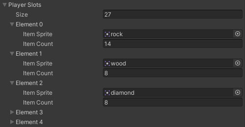 כפי שכבר שמתם לב, ישנם שני מערכים ריקים בשם "Player Slots" ו-"Items". "Player Slots" יכיל את מספר המשבצות הזמינות (עם פריט או ריק) ו-"Items" יכיל את כל הפריטים הזמינים יחד עם המתכונים שלהם (אופציונלי).