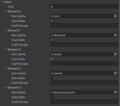 "Stackable" משתנה שולט אם ניתן לערום את הפריטים יחד לחריץ אחד (לדוגמה, אולי כדאי לאפשר ערימה רק עבור חומרים פשוטים כגון סלע, יהלום ועץ).