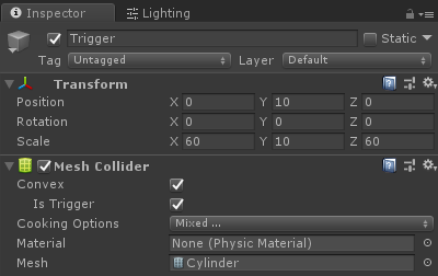 - הוסף את רכיב MeshCollider ל-"Trigger" GameObject, סמן את תיבות הסימון Convex ו-IsTrigger, ושנה את ה-Mesh שלו לצילינדר ברירת המחדל