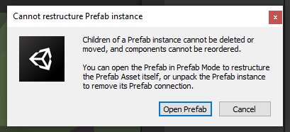 - חלק מהפעולות אינן נתמכות בעת עריכת Prefab ישירות בסצנה, לדוגמה, אם אתה צריך לבנות מחדש את ההיררכיה, תוצג בפניך ההודעה "Cannot restructure Prefab instance" ועם אפשרויות ל-"Open Prefab" או "Cancel".