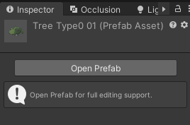 - בחר את Prefab בתצוגת הפרויקט, ולאחר מכן בתצוגת המפקח לחץ "Open Prefab"