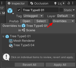 - בעת שינוי Prefab בסצנה, השינויים אינם נשמרים אוטומטית, במקום זאת, עליך לבחור ידנית את אובייקט הבסיס של Prefab, ובתצוגה של Inspector לחץ על "Overrides" ואז לחץ על "Apply All" כדי לשמור את השינויים, או "Revert All" כדי לבטל את השינויים.
